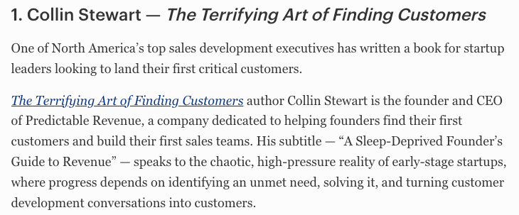 Book update: I probably get a little too excited every time I see new reviews pop up on Amazon, it’s only a few every week but it’s rewarding to see others getting value from your work. We’re up to 15 so far, if you’ve read it and have time to post a review, I’d appreciate the help. Oh, and Forbes mentioned The Terrifying Art of Finding Customers on one of their lists this week, link below.