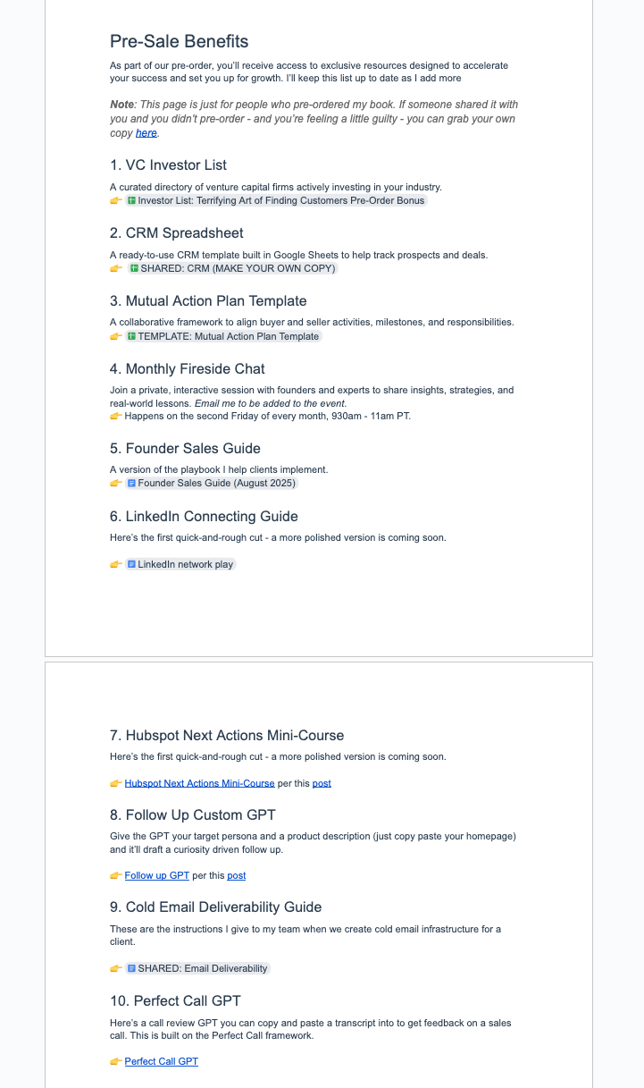 I'll be honest - I didn't expect the response to these bonuses. Founders have been telling me the VC Investor List alone is worth the price of pre-ordering. The Founder Sales Guide has become the most downloaded resource (it's essentially my entire methodology in one place). And the Monthly Fireside Chats? Those are always a highlight of my month.